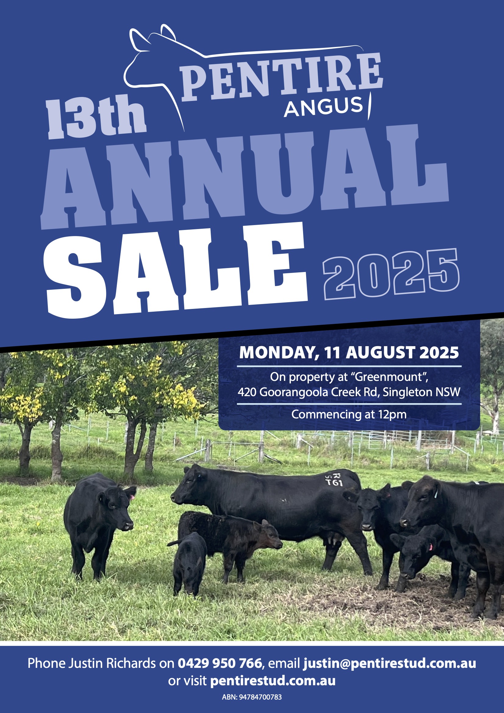 Pentire Angus 13th Annual Sale will be held on Monday 11th August, 12pm on Property at “Greenmount”, Singleton NSW